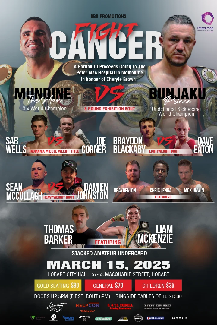 3x Boxing World Champion Anthony ‘The Man’ Mundine steps back into the ring to face 2x Kickboxing World Champion Atdhe ‘Prince’ Bunjaku in an exhibition fight for Fight Cancer, a fight night in Tasmania organised by Grant (Tassie) Brown in honour of his mother Cheryle Brown who passed away from the devastating disease last year. Part of the proceeds will go to the Peter Mac Centre in Melbourne.